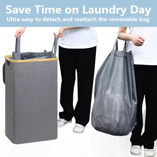 ROSOS Slim Laundry Basket with Lid, 65L Slim Laundry Basket with Removable Laundy Bag, Collapsible Laundry Baskets with Easy Carry Bamboo Handle, Waterproof & Foldable Narrow Laundry Basket, Grey