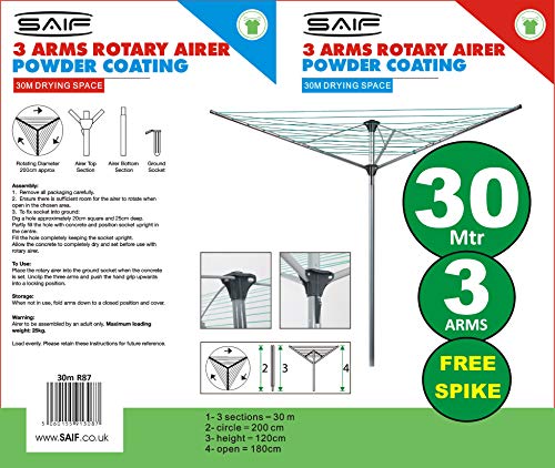 - ✅ 30m 3 Arms Washing Rotary Easy adjustable umbrella system Outdoor Rotary Airer Powder coated Steel typically enough for a family which holds up to four wash loads , Rotary string and UV resistant with non-slip profile, each rope can easily be replaced.