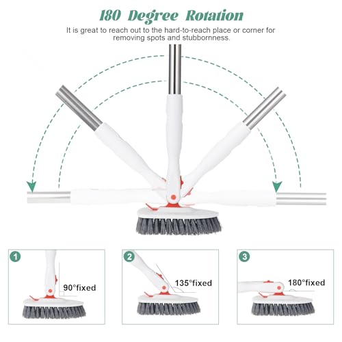 - 🏠【Upgraded Rotating Head, 90°-135°-180° Lockable Angles】The bathroom cleaner brush is designed with an improved 180-degree rotating head, 90°-135°-180° lockable angles, which is uneasy to flip over. It is easy to clean in different directions. No spots and stubbornness would escape from this shower cleaning brush.