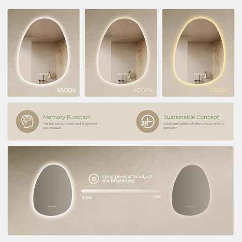 • 3 Color Temperatures & Dimmable with Memory Function: Easily adjust the light color to 2700K (warm light), 4000K (natural light), or 6500K (white light) with a simple touch. Long press to dim the brightness (10%-100%) according to your preference. The smart memory function remembers your last settings, so you don’t have to reset the LED mirror each time.