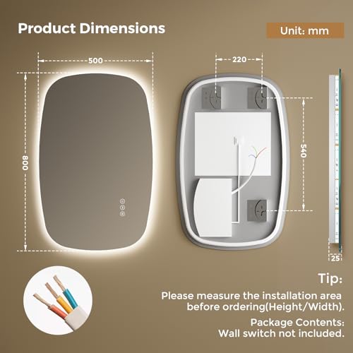 - Practical Touch Switch – The mirror with lights includes a convenient touch button that glows blue in standby mode, making it easy to find in the dark. For complete power-off, you can connect an external wall switch (not included) while keeping the touch function active.