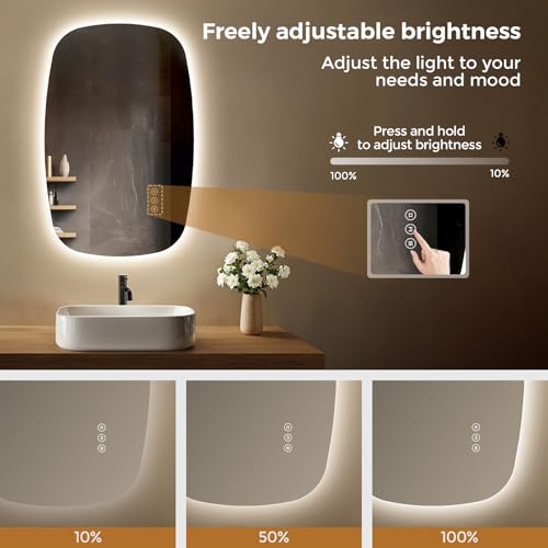 - Three Dimmable Light Colors – The LED bathroom mirror offers three adjustable light colors: warm, neutral, and cool. Its dimmable design allows easy adaptation to different scenarios. The built-in memory function accurately saves your preferred brightness and color temperature, so no need to readjust every time you turn it on.