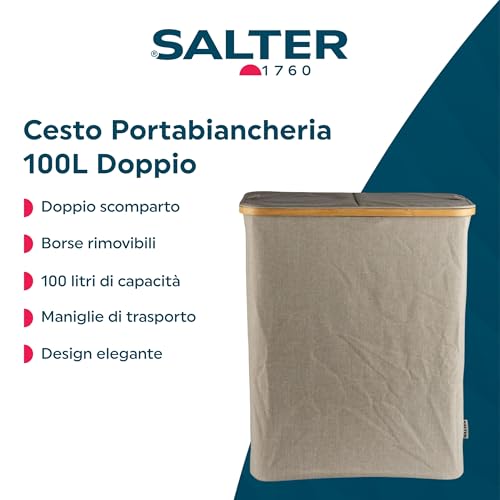 Salter LASAL30292EU7 100L Dual Laundry Hamper – Large Washing Basket with Removable Bags to Separate Laundry, Laundry Bin with Lid, Carry Handles, Easy Manoeuvrability, 54 x 33 x 65cm, Warm Harmony