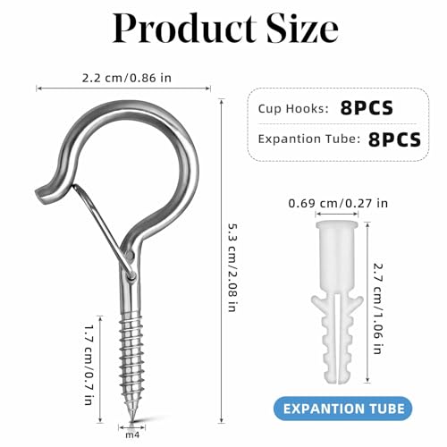 - Value Hook Set – The package includes 8 ceiling hooks and 8 plastic expansion tubes. The smooth surface of the hooks is integrated with any decoration style. It can be used indoors and outdoors, Enough quantity to meet yous hanging demands in daily life. small hooks screw in
