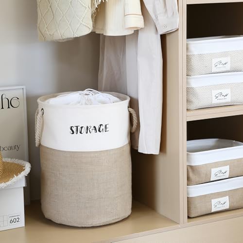 Sea Team Jute and Canvas Storage Basket – Collapsible, Lightweight Laundry Hamper for Home – 46.8L Capacity