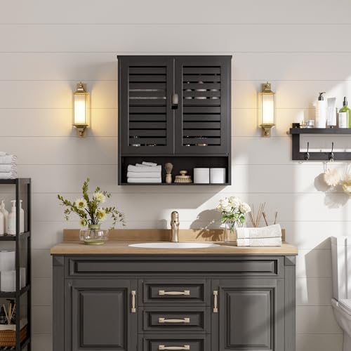 SMIBUY Bathroom Cabinet Wall Mounted, Bamboo Over-The-Toilet Storage Organizer, Space Saver Medicine Cabinet with 2 Door and Adjustable Shelves (Black)