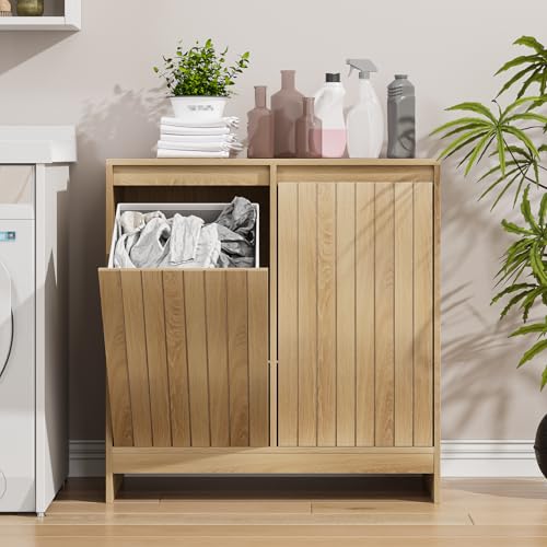 Smuxee Double Tilt-Out Laundry Hamper Cabinet, Concealed Laundry Unit with Dual Baskets, Natural Trash Can for Bathroom & Living Areas