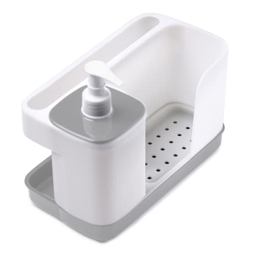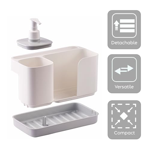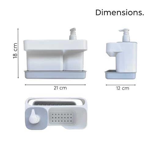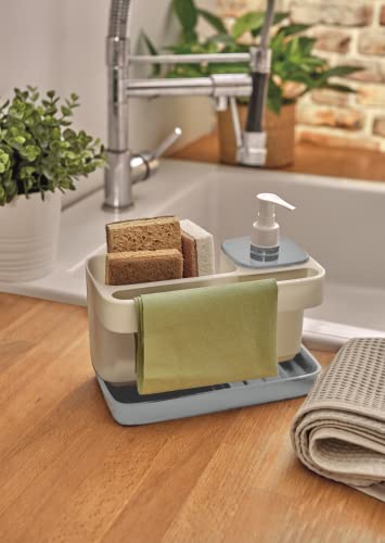 - 3 PRODUCS IN 1: Enjoy the convenience of three essential functions in a single kitchen caddy. It features a 400ml dispenser, perfect for holding liquid soap or dish detergent. The compartment in our kitchen sponge holder for sponges and gloves ensures they have a designated spot, preventing them from getting misplaced. Additionally, the holder for cloths and dishcloths keeps them within easy reach for efficient cleaning.