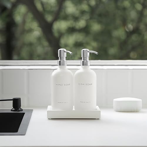 • LUXURY SOAP DISPENSER SET -This set includes two 16.9 oz premium glass bottles with 2CC stainless steel pumps, one hand-made concrete trays.