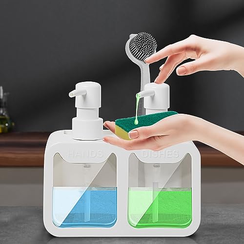 - WHAT YOU GET: 1 x Soap dispenser set with sponge and brush organiser, 2 x 350ml soap dispensers, and friendly customer service!(Note: Sponge and brush are not included)