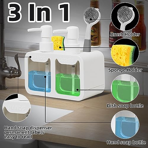 Soap Dispenser,Liquid Hand and Dish Soap Dispenser and Spong Caddy with Brush Holder Countertop Organizer for Kitchen Sink,White