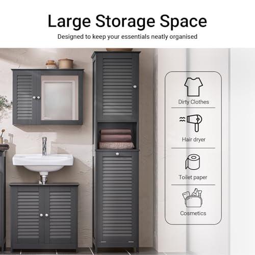 - [Modern Grey Bathroom Furniture]: The sleek grey bathroom storage design complements other bathroom storage units, tallboy cabinets, and bathroom cupboards – ideal for creating a clean, modern, and organized space