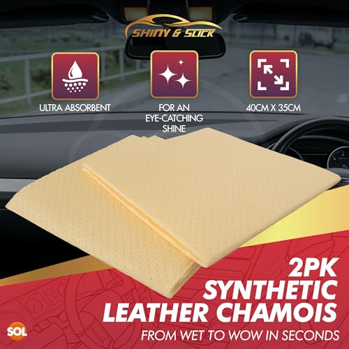 SOL 2pk Synthetic Leather Chamois, 40cm x 35cm Ultra-Absorbent Shammy Cloths for Cars, Windows. Quick-Drying, Durable, Soft Material for Streak-Free, Eye-Catching Shine, Perfect Cleaning Products