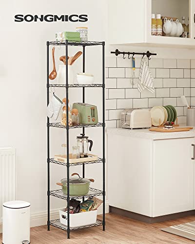 SONGMICS 6-Tier Shelving Unit, Metal Kitchen Storage Shelves, with Adjustable Wire Shelves, PP Liners, 8 Hooks, for Living Room, Garage, 30 x 40 x 160 cm, Black LGR116B01