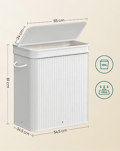 SONGMICS Laundry Hamper with Lid, 100 L Bamboo Laundry Basket, Removable Machine Washable Hamper Basket, with Handles, for Laundry Room, Bedroom, Washroom, White LCB063W01