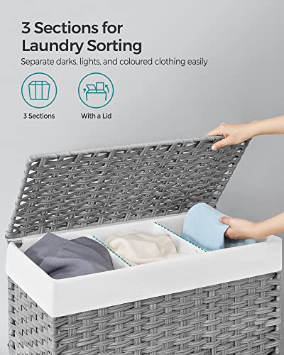 SONGMICS LCB363G01 Laundry Basket with Lid, 140L, Woven Dirty Laundry Basket with Wheels, 3 Compartments, Removable Inner Bag, for Laundry Room, Bedroom, 66 x 33 x 66 cm, Grey