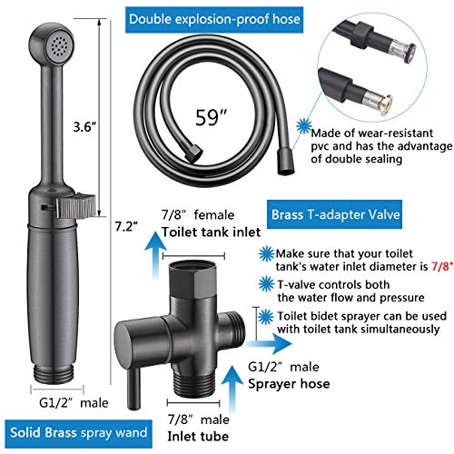 - ►BRASS BIDET TOILET SPRAYER SET: Do not waste your time with cheaply made plastic or stainless steel toilet sprayer attachment that break and leak! Our bidet sprayer head and bidet adapter are made of durable brass with anti-rust black painted, and equipped with a 59” high pressure black shower hose(no kink) made of high-quality PVC and tightly braided nylon to prevent hose bursting. All brass body constructed to withstand high water pressure.