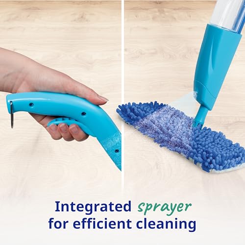 - EASY TO USE: Integrated spray system with reusable bottle allows for fast, effective cleaning without the need for a bucket, while the versatile head switches easily between the two mop head surfaces, making it easy to clean all hard floors
