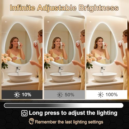 - 3 Colour Temperatures & Dimmable: With its asymmetrical shape, this designed mirror adds charm to any bathroom. The brightness of our LED bathroom mirror can be adjusted easily by long-pressing on touch sensor button, you can switch between the three color temperature modes by simply short-pressing the touch button