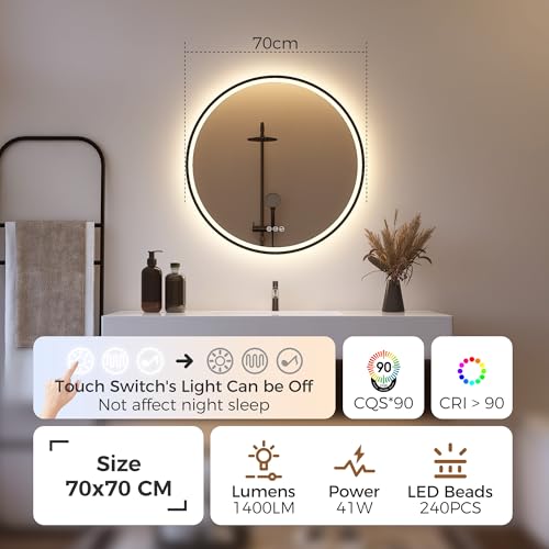 STARLEAD 700 mm Round-Bathroom-Mirror-with-LED-Lights and Bluetooth, LED-Bathroom-Wall-Mirror with Anti-Fog, 3 Colors Dimmable, Memory Function, Tempered Glass, IP44, Black Painted, Not Metal Frame