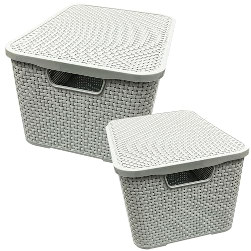 STORM TRADING GROUP Light Grey Rattan Effect Storage Baskets With Strong Lids Ideal For Kitchen, Bathroom, Laundry Room, Home & Office Storage Boxes (2)