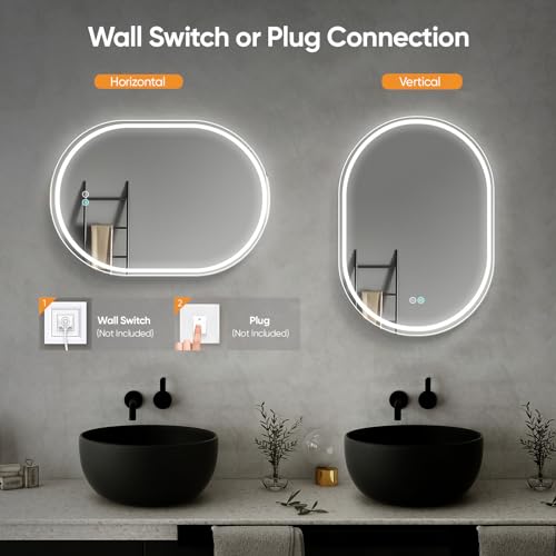 - ✨【 3-color Dimmable Light & Memory Function】he large oval bathroom mirror has 3 lighting modes, you can switch between warm white(3000K), natural light(4500K) and cool white(6000K). In addition, you can touch the power switch button for 2–3 seconds to adjust the brightness from 5% to 100%. Mirror bathroom also has an intelligent memory function that can remember the last light color and brightness settings.