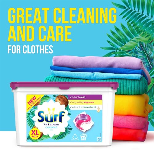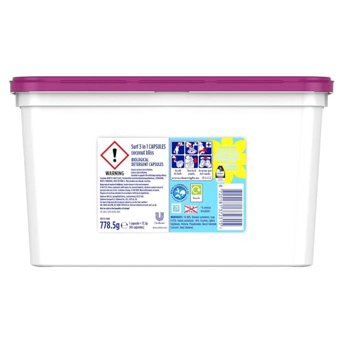 - Surf 3-in-1 Washing Capsules: Packed with even more fragrance, indulge in the uplifting aroma inspired by lush, tropical beaches and exotic escapes – paradise in a tub! Rest assured, your clothes will be brilliantly clean and fresh for longer with these laundry capsules from the UK’s leading fragrance detergent brand.