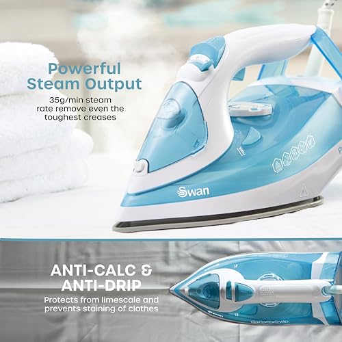 Swan SI12054AQ Steam Iron with Ceramic Soleplate, Pro Steam Technology, Anti-Calc, Anti-Drip, Adjustable Temperature Dial, 2600W, White and Aqua