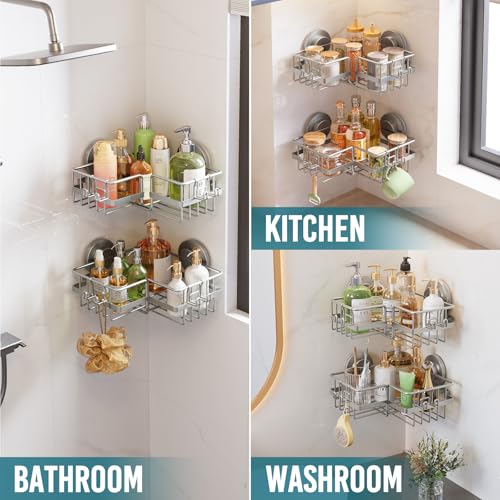 - VERSATILE FIT: With our suction shower caddy, you can organize your personal care products, kitchen tools, and more, ensuring everything is within reach and orderly. Each corner basket has two hooks for bath shower loofahs, shower brushes, and other essentials, making it a perfect storage solution for any space