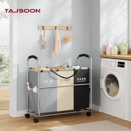 Tajsoon 3 section Laundry Hamper Sorter, Laundry Sorter Cart with Heavy Duty Lockable Wheels and Removable Bags, Laundry Separated Rolling Cart Basket for Clothes Storage, Gray+Beige+Black