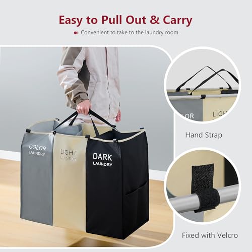 - 【Removable & Portable Laundry Bags】The laundry bag of laundry sorter cart can be completely detached and lifted up as a whole. There are 8 straps at the top, and the straps feature a hook-and-loop fastener design, making them easy to install and remove. This makes the laundry bag easy to clean and convenient to carry to the laundry room.