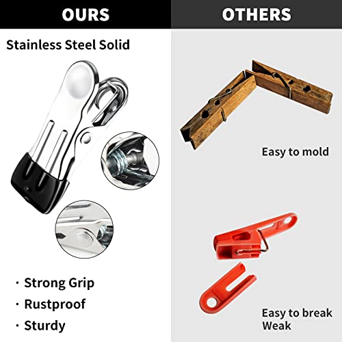 - 👒Premium Material – Made of high-grade stainless steel rather than ordinary plastic, wood or metal, our clothes pegs for washing line show greater ability in corrosion resistance, wear resistance and scratch resistance. Heavy duty, Waterproof, Rust-proof washing pegs perfectly could be your clothes pegs, sock clips, towel pegs, snack clips and photo clips.