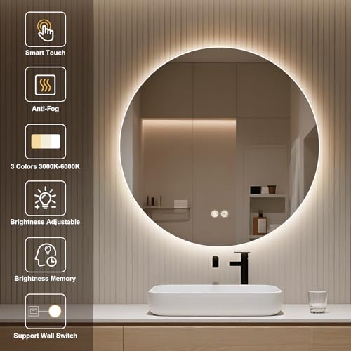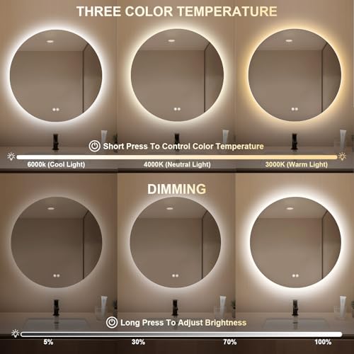 • 3 Color Temperatures & Adjustable Brightness: Our LED bathroom with smart touch sensor, long touch the button for 3 seconds to change brightness from normal to brightest. and color temperature can switch 3000K/4000K/6000K freely with short touching. Whether you need a warm glow for a cozy evening or bright light for precise grooming, find the perfect lighting to match your mood and needs