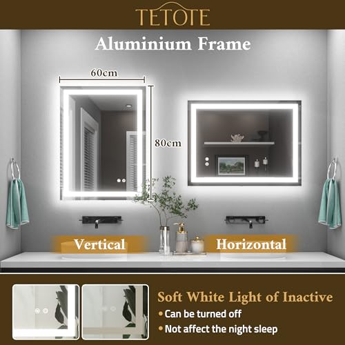 TETOTE 60x80cm Bathroom Mirror with Led Lights, Antifog Wall Vanity Mirror with Lights Back and Front Lit, 3 Colour Dimmable Illuminated Bathroom Rectangle Digital Smart Mirrors