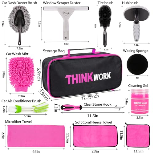 THINKWORK 17Pcs Car Cleaning Kit with Storage Box, Pink Car Washing Gift for Women – Cleaning Gel, Microfibre Cloth, Wheel Brush, Mitt, Duster, Squeegee – for Car Interior and Exterior Cleaning
