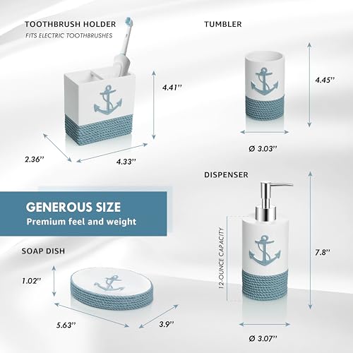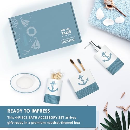 Tide and Tales Nautical Bathroom Decor 4 Piece Bathroom Accessories Set | Rope and Anchor Bathroom Decor with Ocean and Sea Theme | Coastal Bathroom Soap Dispenser Set | Beach Bathroom Decor
