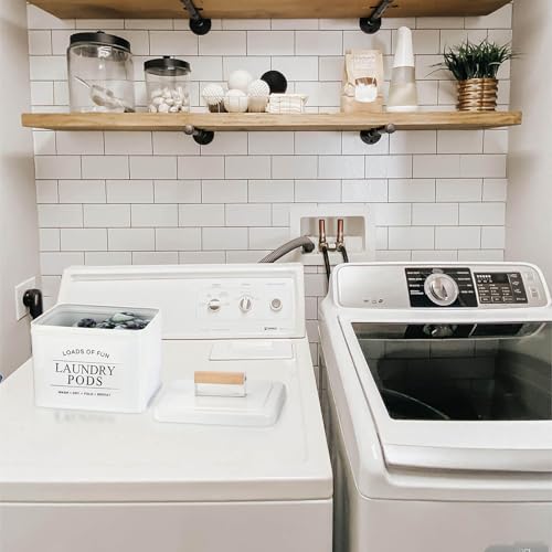 - White Laundry Pods Case — This laundry pods box is a tin metal storage container with wood handle. All white body with black words on the front is pure simple and modern. The farmhouse style can well match different home decor