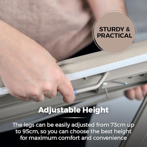 - ADJUSTABLE HEIGHT: Choose the height that best suits your needs, with 7 individual settings ranging from 73cm to 95cm. Simply pull the lever towards the ironing board and click into place to select the desired setting. Teeth on the underside will lock the board into place and keep it secure so that it can’t be accidentally released