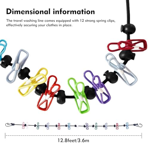 Travel Washing Line, 12 Colorful Clip Portable Clothesline, Travel Washing Line with Pegs, Resuable Indoor Drying Clothes Line & Outdoor Travel Camping Accessories