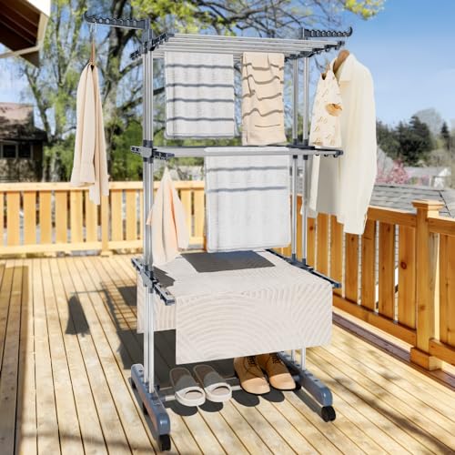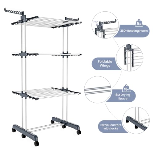 - [Generous Drying Capacity] Boasting an expansive 18 meters of drying space and additional 50 hooks, this large clothes airer ensures ample room for all your laundry needs. Its three spacious tiers allow for wrinkle-free drying of a variety of garments, including shirts, dresses, bedding, and towels.