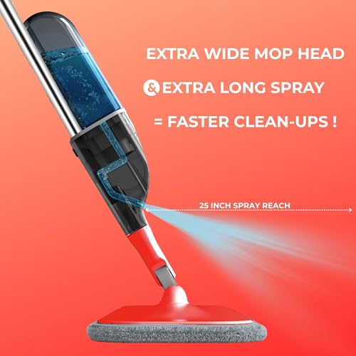 True & Tidy Multi-Surface Spray Mop with Refillable Water Bottle, Use Any Cleaning Solution Easy to Fill and Refill with Machine Washable Mop Pad (Red)