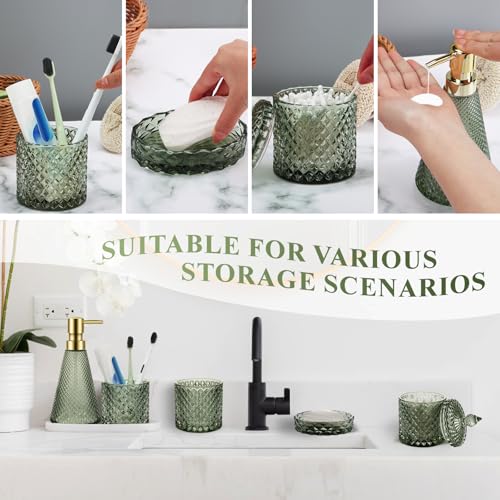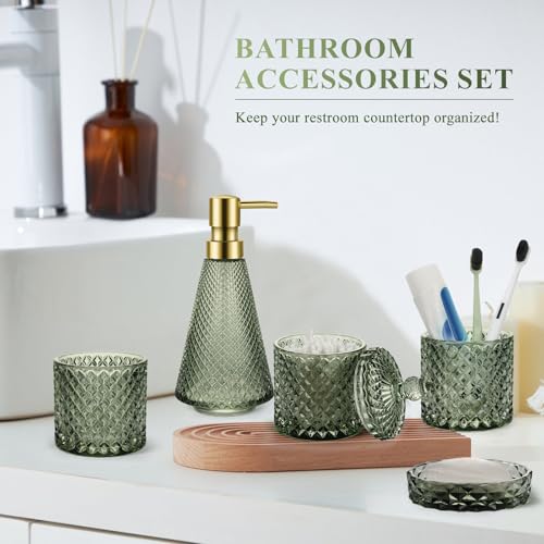 Ulable Green Bathroom Accessory Set, 5Pcs Bathroom Soap Dispenser Set, Green Glass Bathroom Accessory Set with Lotion Dispenser, Soap Dish, Toothbrush Holder, Tumbler, Cotton Swab Jars