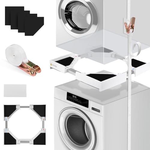 - 【Secure and Functional Design】This washer dryer stacking kit is equipped with ratchet ropes and non-slip pads to securely attach the washer and dryer, preventing any slipping or shifting during The integrated pull-out drying rack in the middle adds extra space for clothes or baskets, enhancing the functionality of your laundry area. Create a safe, stable, and functional laundry setup with this innovative stacking kit.