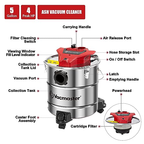 Vacmaster, EAV508S 1101 5-Gallon 8 Amp Ash Vacuum Cleaner Stainless Steel Tank with HEPA Filter & Hose Accessories, Red, 5 Gal