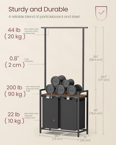 VASAGLE Laundry Sorter, Laundry Hamper 2 Section with Clothes Rack, Pull-Out and Removable Laundry Basket with Shelf, 28.7 x 13 x 69.7 Inches, Rustic Brown and Black UBLH241B01