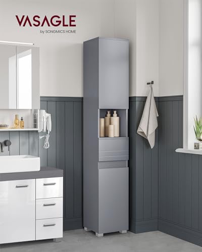 VASAGLE Tall Bathroom Cabinet, Slim Storage Cabinet, Narrow Cupboard, Bathroom Storage Unit, with a Drawer, Adjustable Shelves, 30 x 30 x 170 cm, Mystic Grey BBC560P36