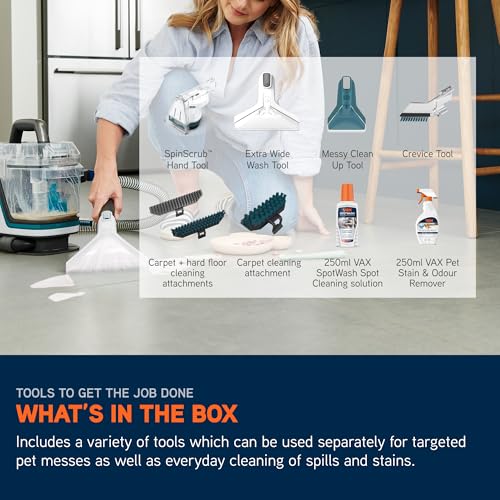 - WHAT'S IN THE BOX – VAX SpotWash Home Pet-Design Spot Cleaner, SpinScrub Hand Tool, Extra Wide 2-in-1 Wash Tool with Carpet and upholstery cleaning attachment and Hard Floor Cleaning Attachment, Messy Clean Up Tool with Carpet Cleaning Attachment, Crevice Tool, 250ml VAX SpotWash Spot Cleaning Antibacterial Solution, 250ml VAX Pet Stain & Odour Remover, Accessory Bag