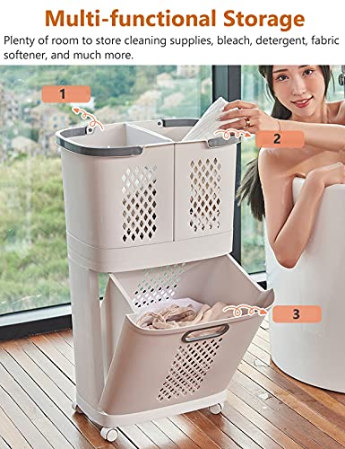 Vertical Laundry Sorter with 2 Tiers Removable Baskets and Wheels Bathroom and Bedroom nizer Shelf for Plastic Tall Laundry Hampers Slim White Cart