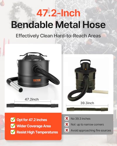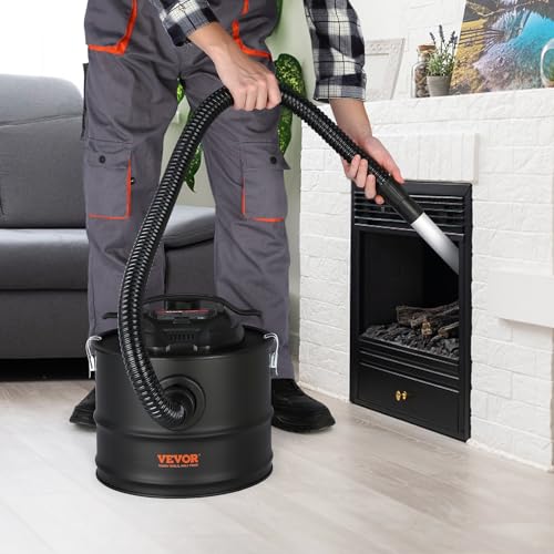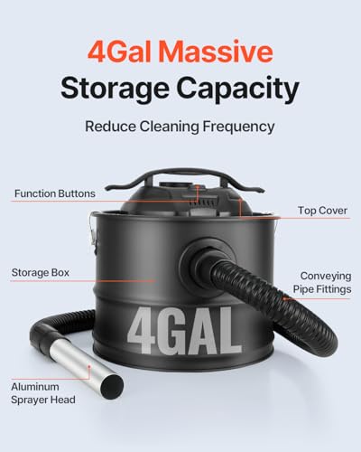 VEVOR Ash Vacuum Cleaner 4 Gallon with 1200W Strong Suction Ash Vac Collector with Wheels and 47.2-in Flexible Hose for Grills Fireplaces Pizza Ovens Log Burner Pellet Stoves Wood Stove