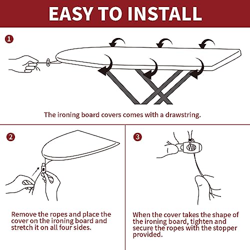 - FITS IN SECONDS: Our ironing board cover is easy to place on since it has an adjustable elastic edging for a quick and secure fit, as well as a strong shrink rope to fit your boards seamlessly. Our cover will stay securely in place on your board and you may concentrate solely on your garments!